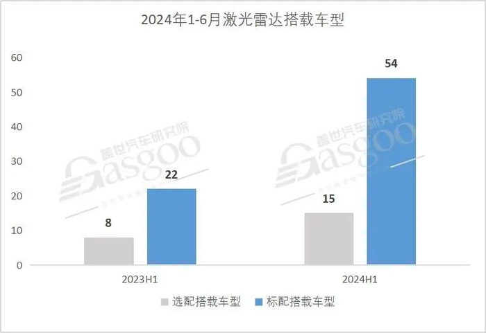 同时,标配激光雷达的车型销量同比增长高达247%,6月单月销量更是达到12.7万辆,单月渗透率达到7.4%,创下历史新高,说明消费者对于激光雷达方案的接受度显著提升。上半年内,标配激光雷达的车型数量达到54个,提供选配的车型也有15个,均为去年的两倍,说明车企更加重视搭载激光雷达的高阶智驾方案车型落地。综合这两点,才促成了今年上半年激光雷达市场的爆发式增长。