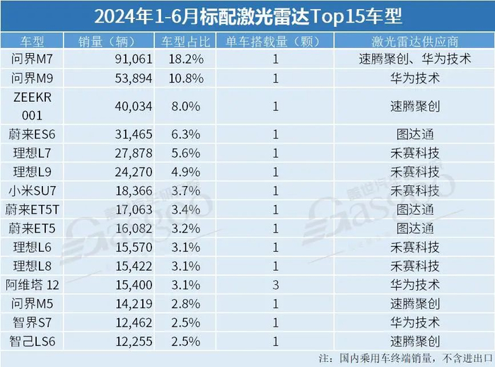 从2024上半年标配激光雷达Top15销量的车型来看,目前市场上大多数方案仍以一颗车顶瞭望式激光雷达为主,这种布局方式不仅检测视野广阔,还能有效降低成本,相较于车前两颗激光雷达的布局更具经济性。而随着整体市场的进一步细分,激光雷达的布局方案或将更加多样化,以满足不同车型和场景的需求。
