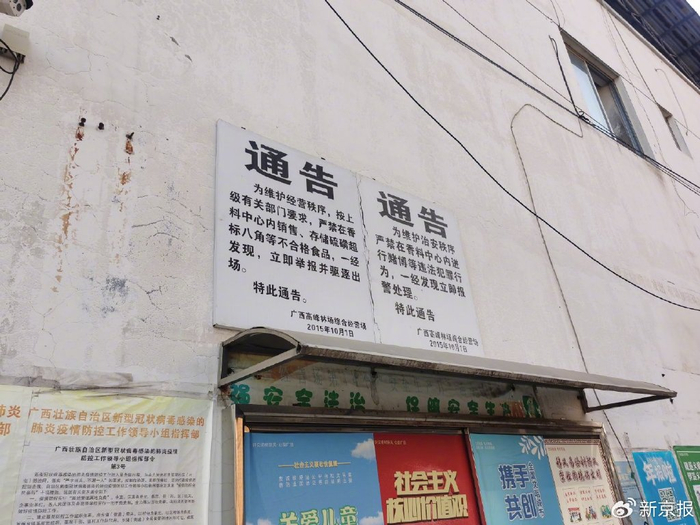 广西南宁市高峰天然香料物流中心内张贴着2015年10月1日发布的通告,通告明令禁止在香料中心内销售、存储硫磺超标八角等不合格食品,一经发现,立即举报并驱逐出场。新京报记者 王瑞文 摄