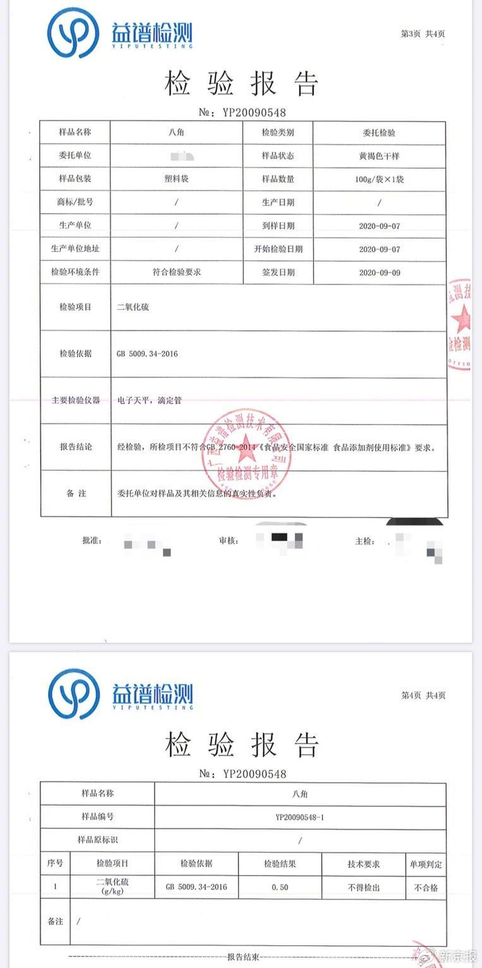 9月7日,新京报记者从高峰市场6家摊位获取了共计100克八角,作为检验样本送往广西一家检测机构进行二氧化硫检测。加盖有CMA标识(中国计量认证)的检验报告显示:经检验,样品二氧化硫含量为500mg/kg,技术要求不得检出,单项判定不合格。