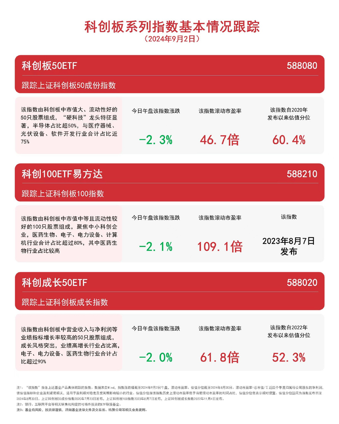 科创板系列指数回调,科创100ETF易方达(588210)、科创板50ETF(588080)等产品聚焦战略性新兴产业 每日经济新闻 每日经济新闻官方账号 2024.09.0213:07 关注 截至午盘,今日上证科创板成长指数下跌2.0%,科创100指数下跌2.1%,上证科创板50成份指数下跌2.3%。