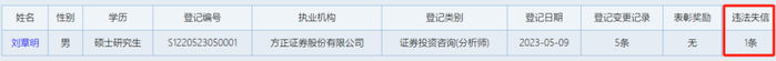 例如,最近传出降职为方正证券研究所副所长的刘章明,就有一条“违法失信”记录,是因为年初方正证券研报业务合规问题而受罚。