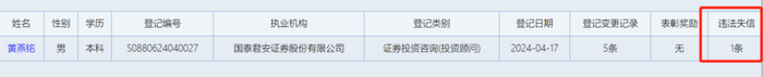 又如,国泰君安研究所原所长黄燕铭也有一条“违法失信”记录。2023年6月,上海证监局曾对国泰君安出具警示函。上海证监局表示,经查,发现国泰君安关于发布证券研究报告业务质量控制和合规审查的制度规定不完善,未建立有效的证券研究报告市场影响评估机制,未对某证券研究报告相关敏感信息可能对市场产生的影响进行审慎评估。而作为当时的研究所所长,黄燕铭对研究所存在的问题负有管理责任,因此也被出具警示函。