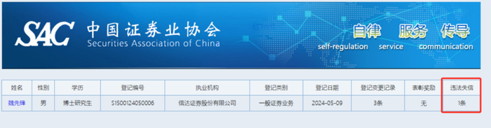 不过,中国证券业协会(下称“中证协”)的个人公示信息显示,魏先锋有一条“违法失信”信息。一时间,信达证券也因聘任有“违法失信”履历人员而引发外界争议。无独有偶,券商中国记者日前也收到举报邮件称金元证券聘任有“违法失信”信息记录的高管。