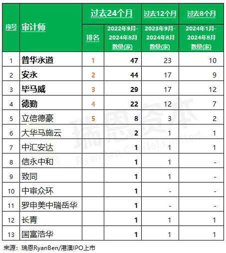 根据统计,在过去的24个月,共有 13间审计师参与 158家新上市公司的审计业务。