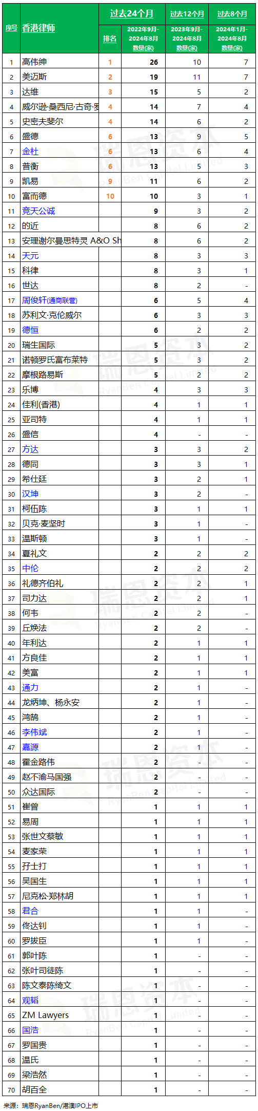 根据统计,在过去24个月共 70间香港律师参与 158家新上市业务。