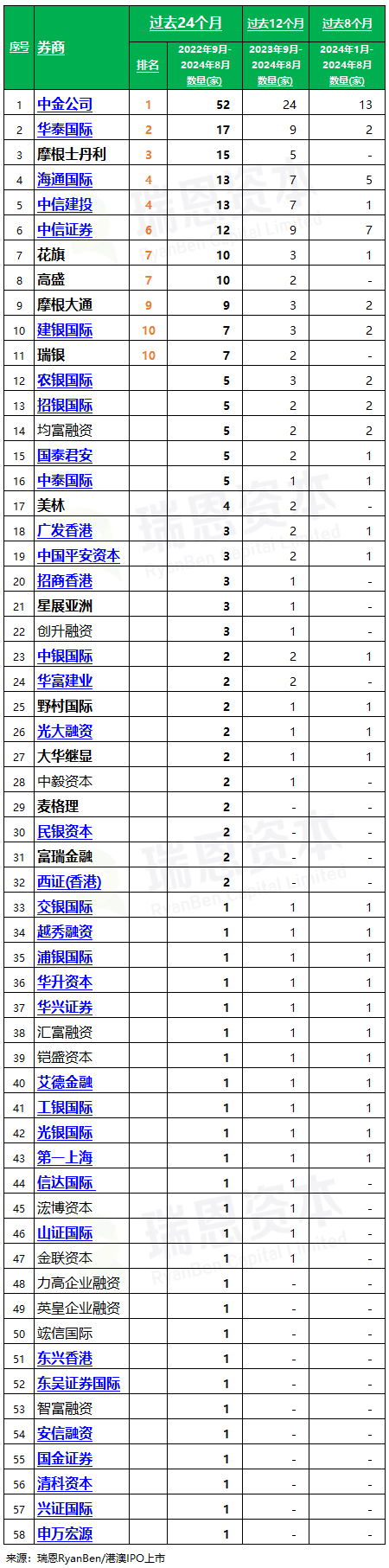 香港上市中介机构排行榜:中金、普华永道、竞天公诚、高伟绅,保持领先(过去两年:截至2024年8月)