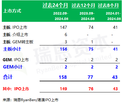 在过去的24个月(2022年9月至2024年8月)香港新上市公司158家,主板上市156家(包括:147家IPO上市、6家介绍上市、3家GEM转主板),GEM(创业板)上市2家;