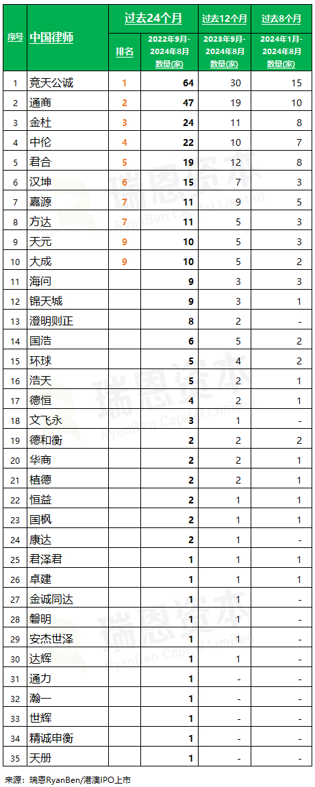 根据统计,在过去的24个月,共 35间中国律师参与154家(涉及到中国业务或资产)新上市。
