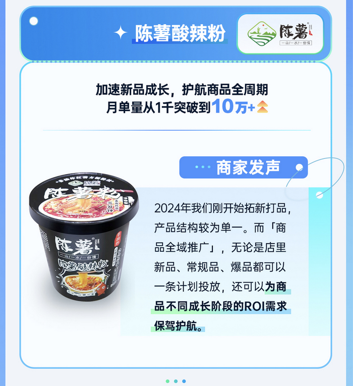食品商家陈薯酸辣粉之前销售的商品结构相对单一。其于今年正式启动新品开拓项目,丰富店铺货盘结构。打爆新品过程中,陈薯酸辣粉使用了「商品全域推广」,不仅令新品快速起量,也带动商家月销售单量从1千跃升至超10万单,店铺内的常规品、爆品销售全都获得可观增长。