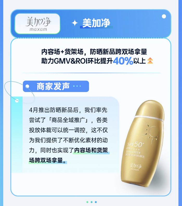 美妆护肤品牌美加净,在今年4月推出防晒新品后,就率先尝试使用了「商品全域推广」,统一调控各类投放素材,让新品在内容场、货架场双场高效获得流量,推动GMV&ROI环比提升超过40%。同时,「商品全域推广」在协同自然流量与付费流量时,也给到商家了更多持续优化素材的时间和动力,形成了生意增长的正循环。