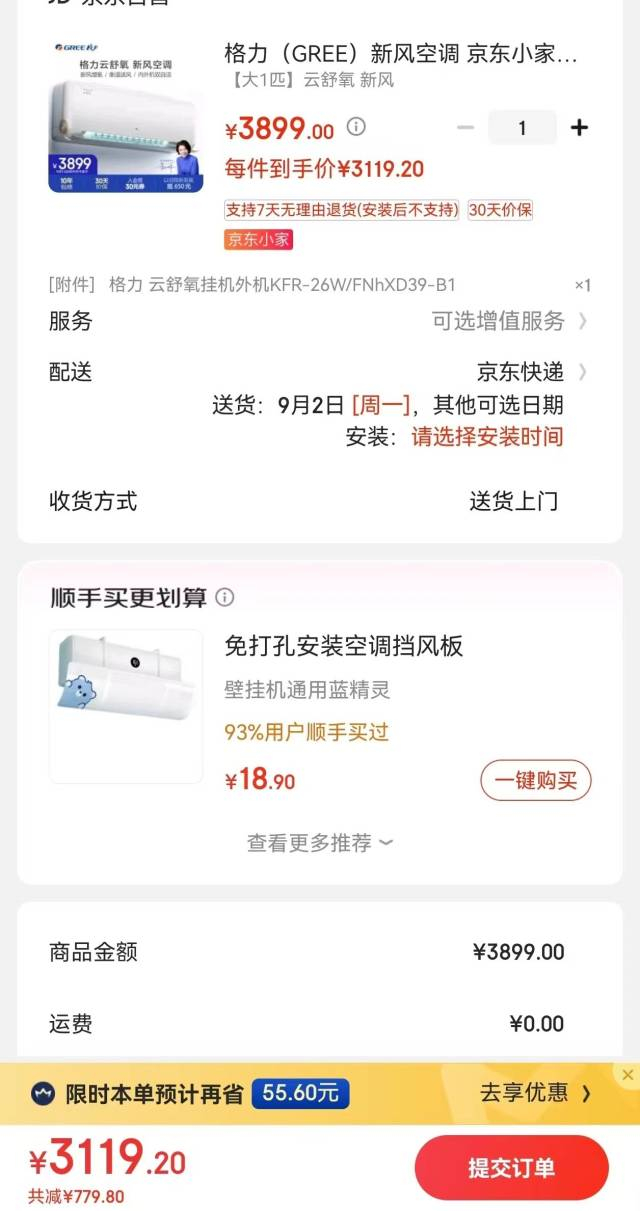 以格力品牌一款新1级能效变频、带新风功能的大一匹空调为例,记者对比发现,未领取补贴情况下,京东平台显示的价格为3899元。领取补贴后,新购该产品的价格降至3119元,便宜了764元,优惠20%。