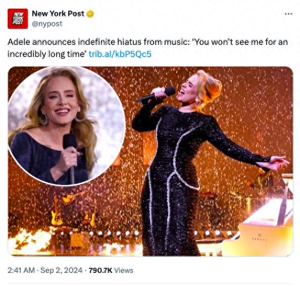 阿黛尔宣布将无限期中断音乐事业:“你们在很长一段时间内看不到我了。”