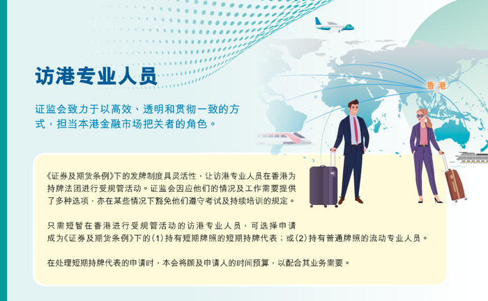 香港《证券及期货条例》下的发牌制度具灵活性,让访港专业人员在香港为持牌法团进行受规管活动。证监会因应他们的情况及工作需要提供了多种选项,亦在某些情况下豁免他们遵守考试及持续培训的规定。