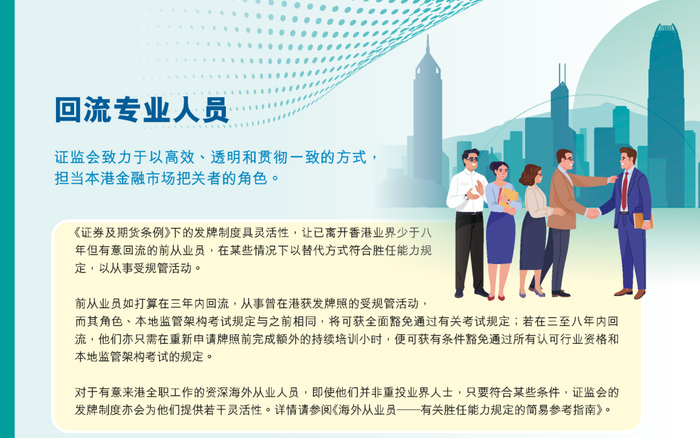 9月2日,香港证券及期货事务监察委员会(以下简称香港证监会)发表两份新的简易参考指南,以协助访港及回流香港的专业人员了解香港证监会务实的发牌制度。