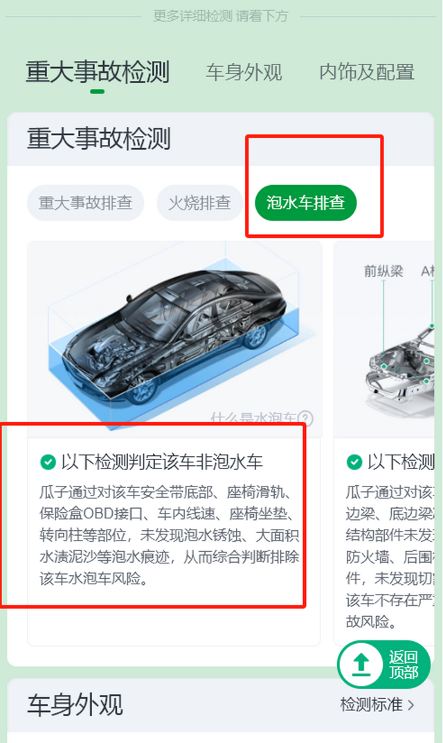 对此纠纷,澎湃新闻联系了瓜子二手车。工作人员称,8月份检测报告的结论由检测人员上传车辆照片后系统自动判定。“如果最终判定该车在消费者购买之前就有水泡嫌疑,平台承诺终身包退。”