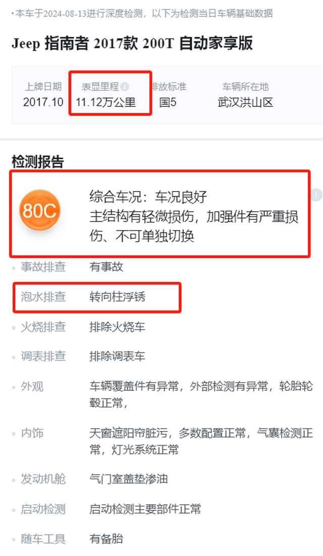 余先生提供的今年8月份瓜子二手车出具的官方检测报告截图显示,该车事故排查一项为“有事故”,泡水排查一项为“转向柱浮锈”,泡水检测显示右后地毯有霉斑、仪表台内骨架有锈渍/锈蚀、左侧门槛梁内侧及空腔有水渍泥沙等。