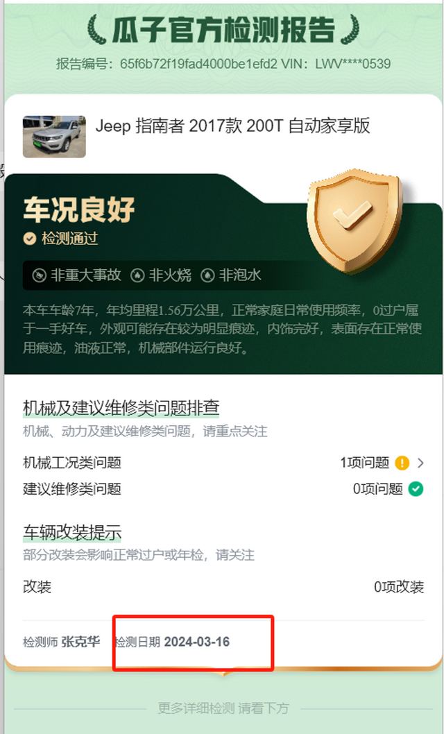 余先生提供的“瓜子官方检测报告”显示,瓜子官方检测报告称该车车况良好,“本车车龄7年,年均里程1.56万公里,正常家庭日常使用频率,0过户属于一手好车,外观可能存在较为明显痕迹,内饰完好,表面存在正常使用痕迹,油液正常,机械部件运行良好”。