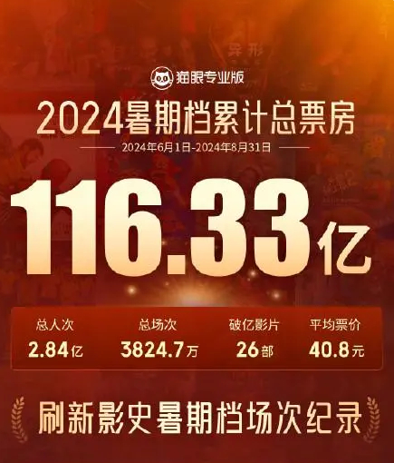 猫眼专业版数据显示,截至8月31日21时,2024年暑期档(6.1—8.31)以116.33亿元票房落下帷幕,总观影人次2.84亿,总场次数3824.7万场,打破中国影史暑期档总场次数纪录。档期内共有26部影片破亿,数量为近6年最多。