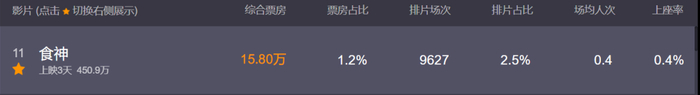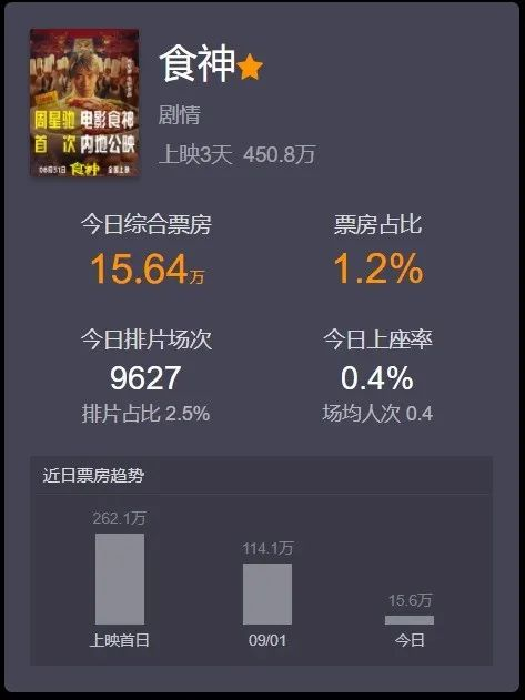 据猫眼专业版数据,《食神》上线首日,票房262.1万,随后有所下滑。截至9月2日14:53,综合票房15.64万,在正在上映的电影中位列第11名,票房占比1.2%,排片占比2.5%,上映3天票房约450万。