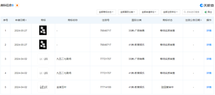 天眼查知识产权信息显示,9527剧场有限公司已申请注册1枚“金猪玉叶”商标,国际分类为教育娱乐,当前商标状态为等待实质审查。9527剧场有限公司于今年3月在香港注册成立,除上述“金猪玉叶”商标外,还申请了广告销售、教育娱乐类“九五二七剧场”商标。