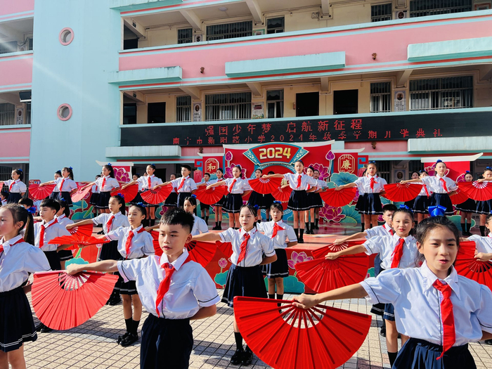 少年自当扶摇上,揽星衔月逐日光,少年不惧岁月长,风雨不改凌云志。南宁市新阳路小学开学典礼以“强国少年,未来有我”为主题。开场舞《少年有志》点燃同学们的激情,同学们身着统一的服装,饱满的精神、灿烂的笑容,展现了新时代少年的蓬勃朝气和对未来的无限憧憬。响彻校园的爱国诗朗诵和爱国手势舞将整场活动推向了高潮,同学们用铿锵有力的声音朗诵《少年中国说》,将《少年中国说》中的经典语句以手势舞的形式展现出来,不仅让在场的每一个人深受感动和鼓舞,也进一步激发了同学们的爱国热情和民族自豪感,更深刻地诠释了“少年强则国强”的深刻内涵。