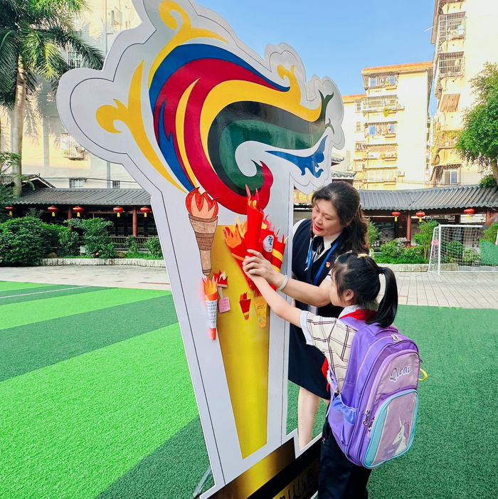 明秀小学开学典礼上,孩子们触摸“火炬”,追求更精彩的自己。