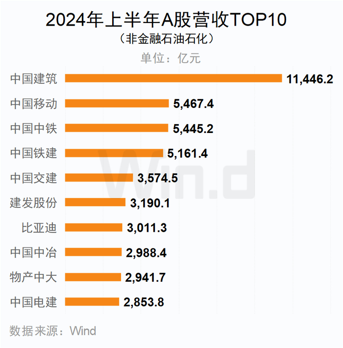 剔除石油石化及金融企业后,中国建筑以1.14万亿元的营收位居首位,中国移动、中国中铁、中国铁建紧随其后,上半年营收均突破5000亿。