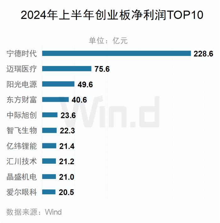 创业板方面,宁德时代以228.6亿元的净利润位居第一。