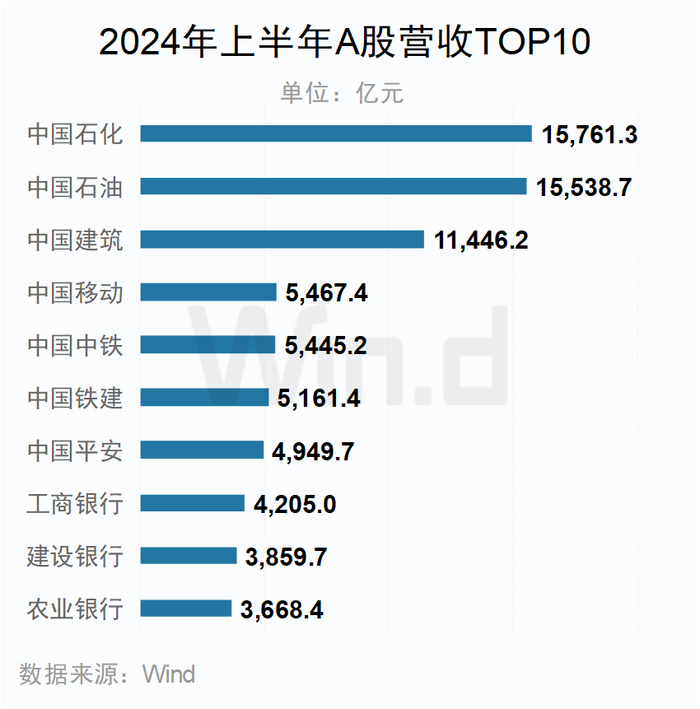 2024年上半年营收排行榜中,前三名齐超万亿,“两桶油”稳居榜单前二名。