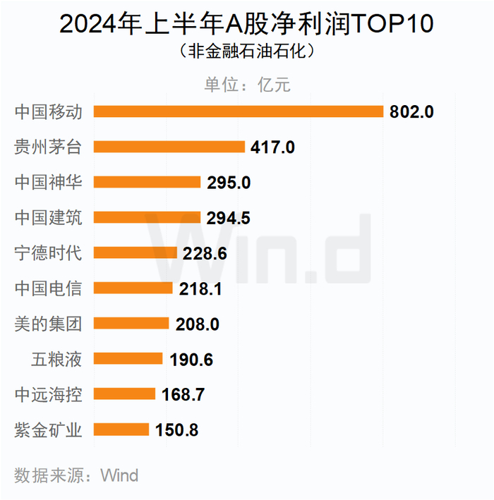 剔除两油金融类公司后,中国移动以802亿元的净利润位居第一;贵州茅台紧随其后,上半年盈利达到417亿元。