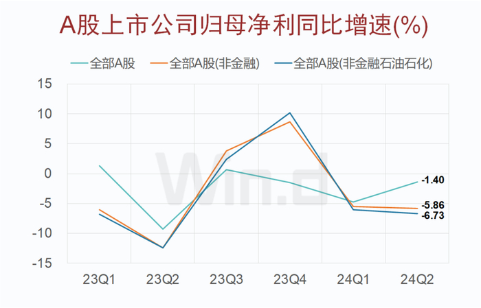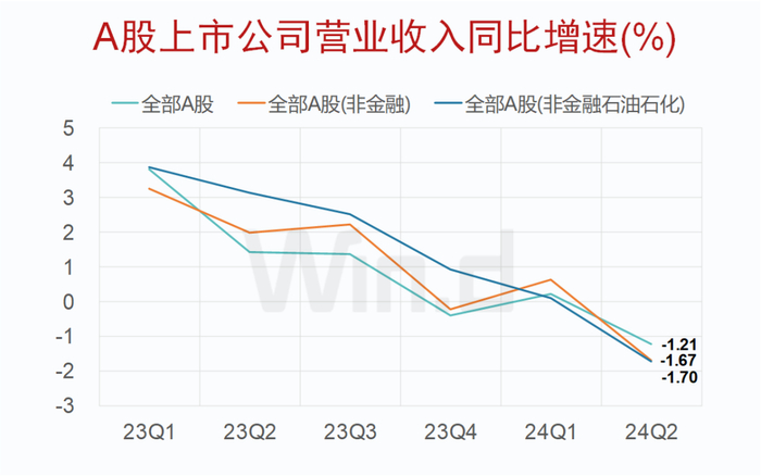从单季度可比数据来看,2024年第二季度,A股上市公司营业收入同比下降1.21%。剔除金融石油石化后,同比增速依次为A股非金融(-1.67%)、A股非金融石油石化(-1.70%)。