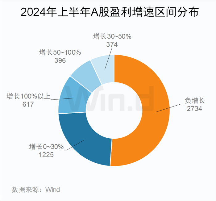 从上市公司中报业绩分布来看,2024年上半年A股共有2612家公司实现归母净利润正增长,占比49%。其中净利润增长100%以上的公司617家,50%-100%之间的有396家,50%以下的1599家,占比分别为12%,7%及30%。此外,2734家公司净利润呈现负增长局面。