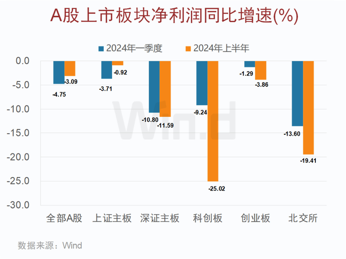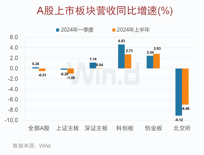 具体分板块来看,2024年上半年创业板、科创板和深证主板营收同比实现正增长,增速分别为2.83%、2.73%和0.04%。
