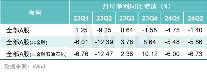 归母净利润方面,2024年第二季度,A股净利润同比下降1.40%,增速较一季度回升3.35个百分点;剔除金融石油石化后,同比增速依次为A股非金融(-5.86%)、A股非金融石油石化(-6.73%),较一季度分别下降0.38个百分点、0.73个百分点。