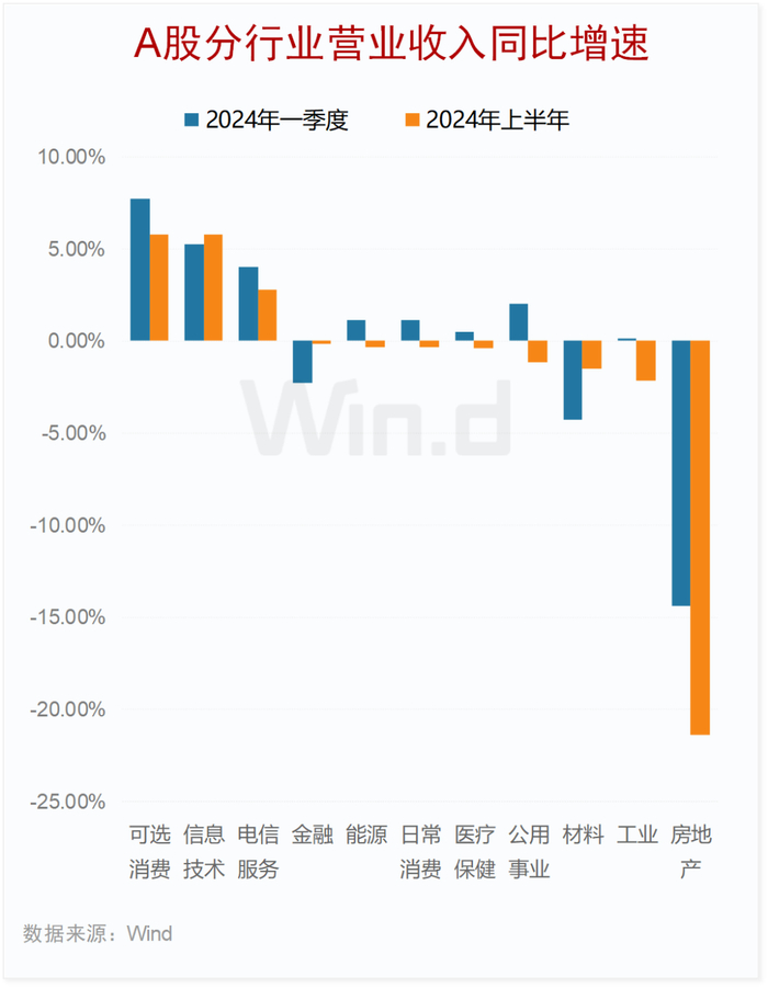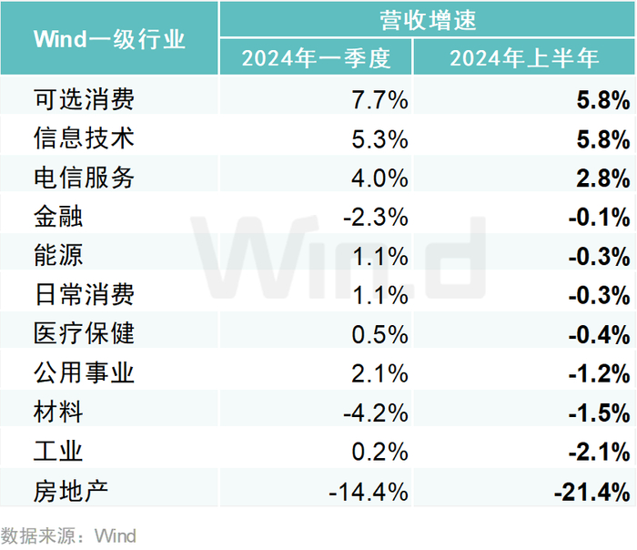 从行业看,2024年上半年,可选消费(5.8%)、信息技术(5.8%)和电信服务(2.8%)三大行业营收实现正增长。