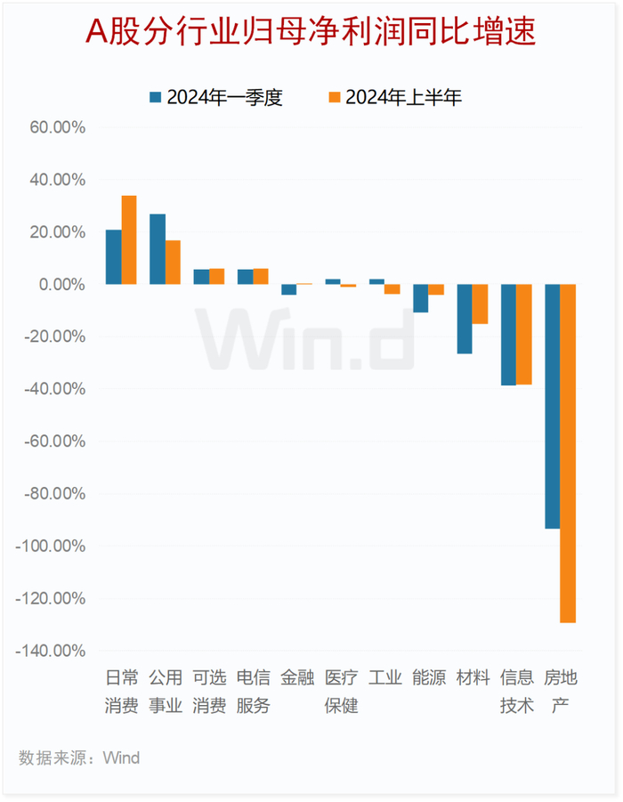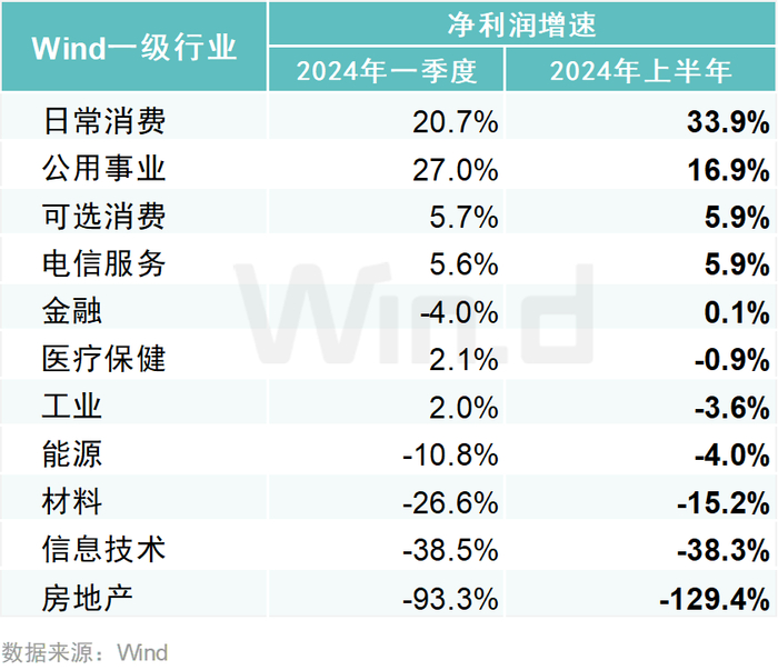 从净利润增速水平来看,日常消费(33.9%)、公用事业(16.9%)、可选消费(5.9%)、电信服务(5.9%)等行业2024年上半年归母净利润同比增速相对较高。