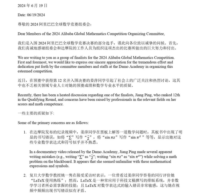 阿里巴巴全球数学竞赛多名选手,更是联名请愿,要求组委会就「姜萍事件」展开第三方独立调查。