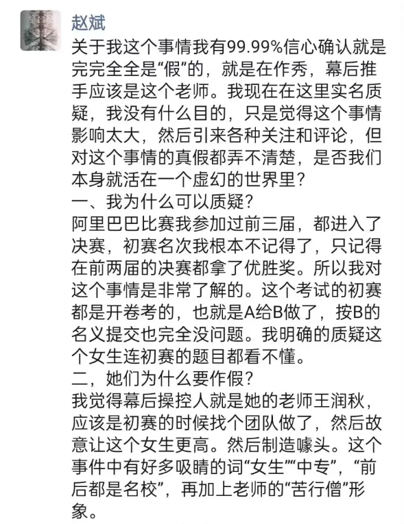 北大硕士、知名高中数学竞赛教练赵斌在朋友圈直言:这场线上考试,是姜萍的老师王闰秋在幕后操控。