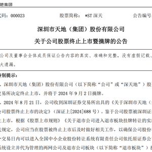 9月1日晚间,*ST深天公告称,公司股票已被深圳证券交易所决定终止上市,并将于2024年9月2日摘牌。