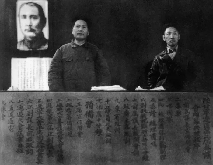 1941年11月6日,陕甘宁边区第二届参议会开幕,参议会秘书长南汉宸(右)主持会议,中共中央主席毛泽东到会表示祝贺并发表讲话