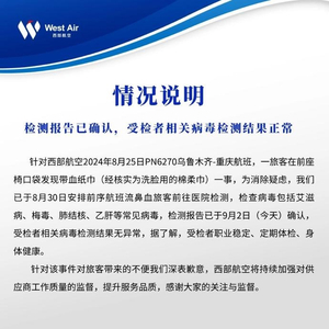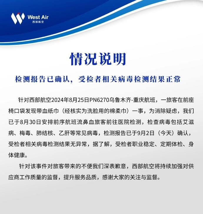 西部航空再通报“带血湿纸巾”事件:受检者相关病毒检测结果正常 界面新闻 界面新闻官方账号 2024.09.0218:03 关注 9月2日,西部航空再就“带血湿纸巾”事件发布情况说明:检测报告已确认,受检者相关病毒检测结果正常。