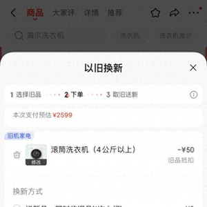 登录京东平台后,记者发现,平台专门在商品的购物页面,为以旧换新开辟了专区。记者随即选购了一款洗衣机,准备尝试以旧换新服务。但选购好新品后,如果想要进行以旧换新,必须首先“确认并同意”平台制定的《以旧换新交易协议》。如不点击同意按钮,则无法正常下单。