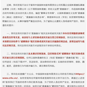 公司及公司关联方从未通过任何渠道、以任何形式对“盛康基办”相关实体或者其关联方进行任何授权。任何以国新盛康的名义(包括“盛康基办”“盛康优配”等),以任何途径(包括下载APP、发送短信、添加微信好友等)实施的投资理财、借款、融资、配资、退款等行为均是诈骗行为,请注意防范风险。