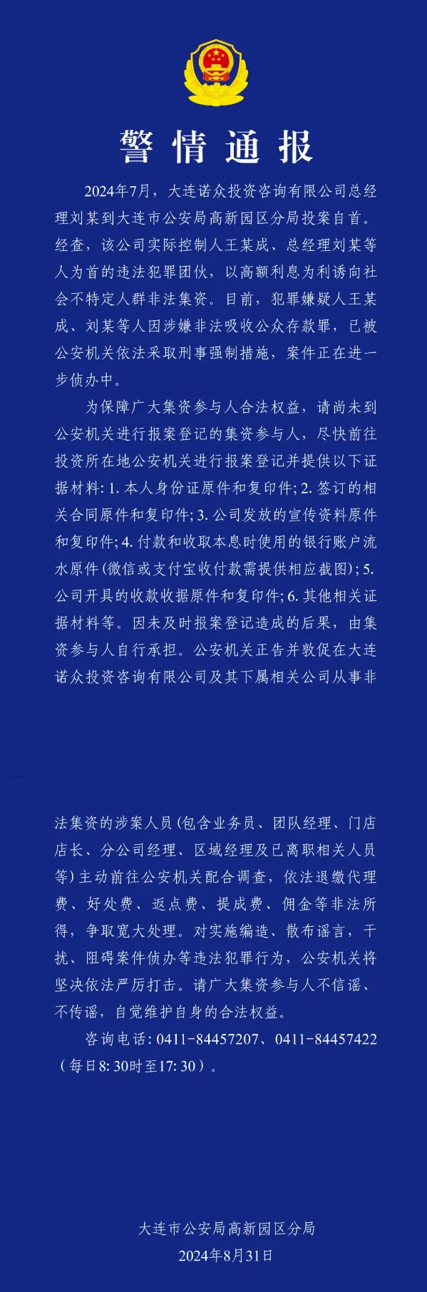 8月31日晚间,大连市公安局高新园区分局发布警情通报称,2024年7月,大连诺众投资咨询有限公司(简称“诺众投资”)总经理刘某到大连市公安局高新园区分局投案自首。经查,该公司实际控制人王某成、总经理刘某等人为首的违法犯罪团伙,以高额利息为利诱向社会不特定人群非法集资。目前,犯罪嫌疑人王某成、刘某等人因涉嫌非法吸收公众存款罪,已被公安机关依法采取刑事强制措施,案件正在进一步侦办中。