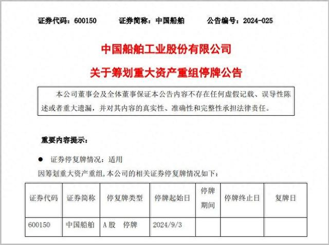 9月2日,中国船舶(600150)发布关于筹划重大资产重组停牌公告,称为进一步聚焦国家重大战略和兴装强军主责主业、加快船舶总装业务高质量发展、规范同业竞争、提升上市公司经营质量,公司与中国重工(601989)签署了《吸收合并意向协议》,筹划由中国船舶通过向中国重工全体股东发行A股股票的方式换股吸收合并中国重工。