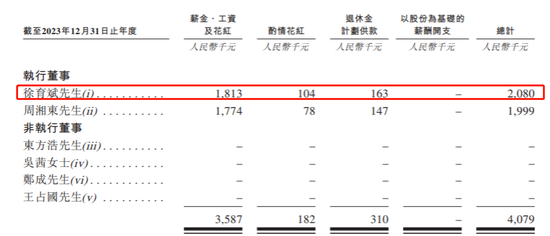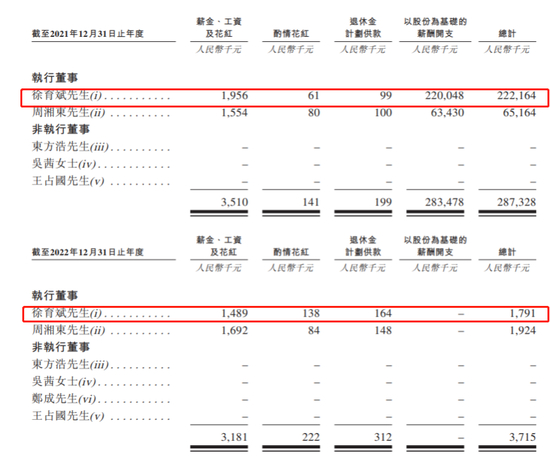2021年至2023年,徐育斌薪酬总计分别为2.22亿元、179.1万元、208万元。其中,2021年薪酬2.22亿元,以股份为基础的薪酬开支就为2.2亿元,后两年均没有以股份为基础的薪酬开支。