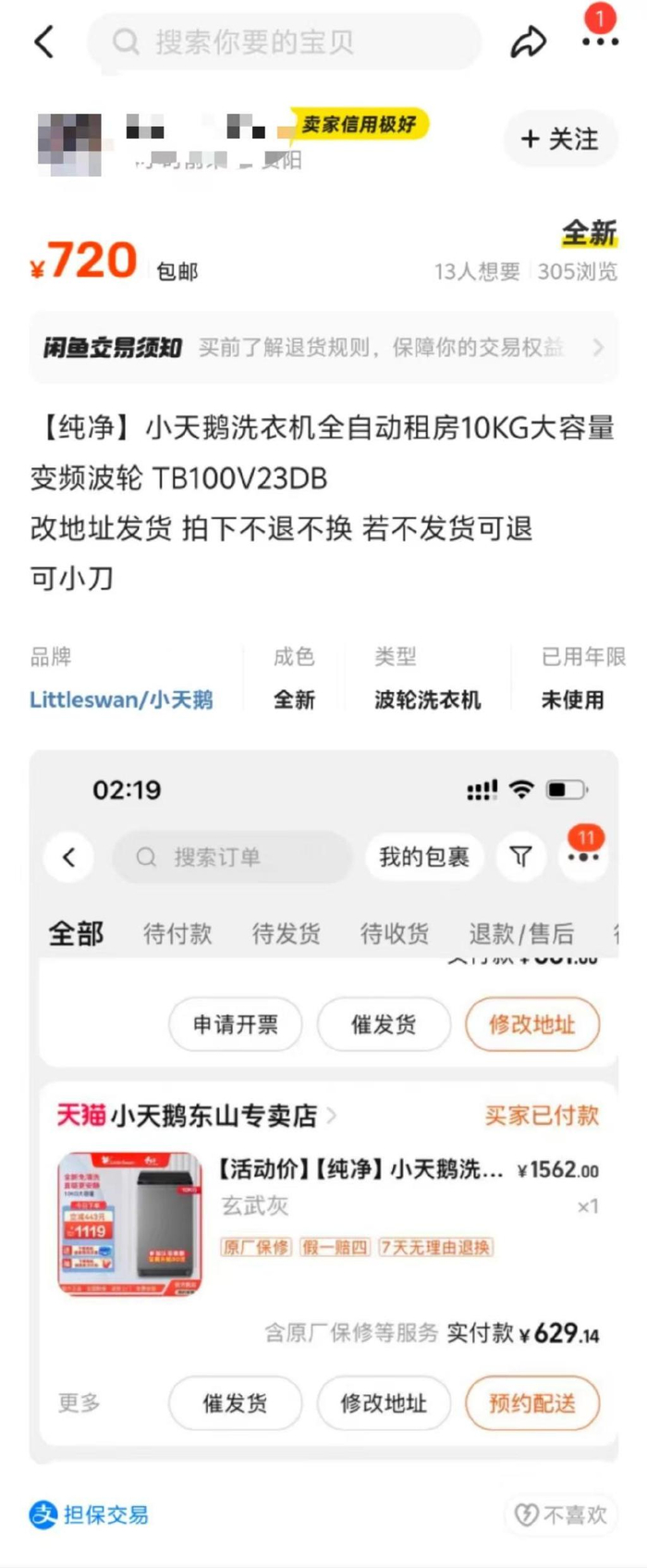 红星新闻注意到,在二手平台闲鱼上,已有一些网友对自己低价抢购的小天鹅洗衣机加价出售。如一名网友挂出的信息显示,其在“小天鹅东山专卖店”以约629元的实付款,抢购的价值1562元洗衣机,正在以720元的价格进行转卖。转卖介绍中称:“可改地址发货……若不发货可退,(价格)可小刀。”