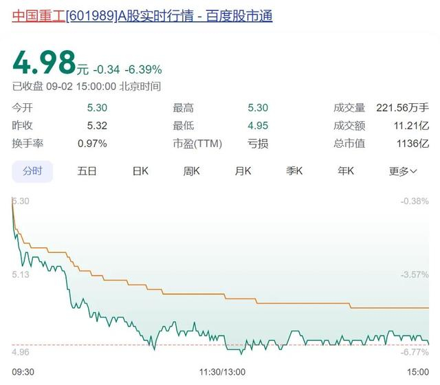 值得一提的是,中国船舶、中国重工9月2日均出现大跌,截至收盘中国船舶大跌超过9%,股价报34.9元,中国重工股价报4.98元,大跌6.39%。