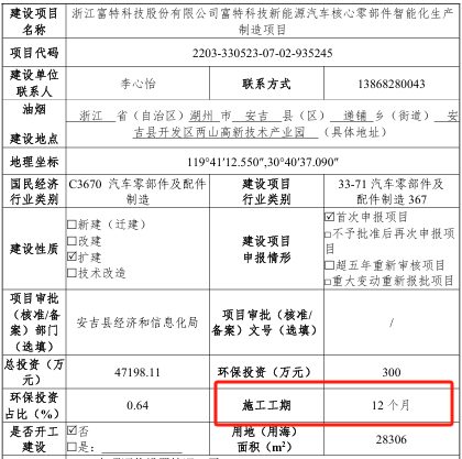 但是据智能制造项目环评文件,该项目施工工期仅为12个月。另《安吉发布》微信公众号曾在2023年12月28日报道过该项目建设进度,已完成主体厂房建设,预计2024年四季度投产。